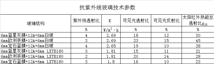 Anti-UV parameters: ultraviolet transmittance, visible light transmittance, total solar infrared heat transmittance gIR, and heat transfer coefficient K.