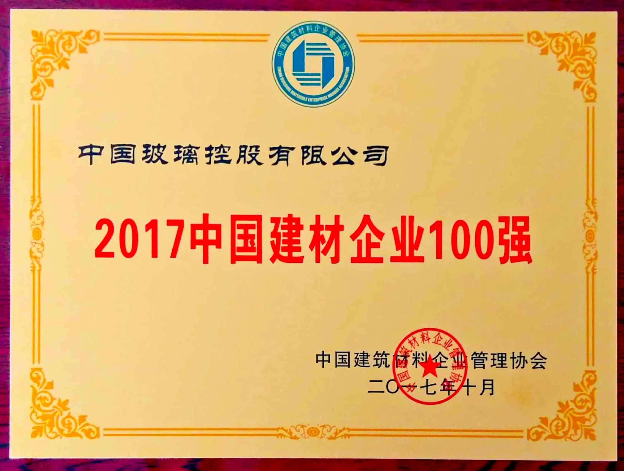 2017年10月26日,由中国建筑材料联合会指导、中国建筑材料企业管理协会与中国建筑材料工业规划研究院主办的“2017中国建材企业创新发展论坛暨‘中国建材企业500强、服务业100强、最具成长性100强、民营企业100强和园区20强’发布会”在北京举行。中国玻璃控股有限公司获得“2017中国建材企业100强”的殊荣。