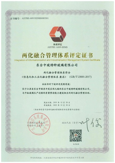近日从“两化融合服务平台”获悉,中国玻璃控股有限公司东台基地两化融合管理体系于2019年12月28日通过认证并取得"两化融合管理体系认证证书",成为东台市首家通过该项体系认证的企业。