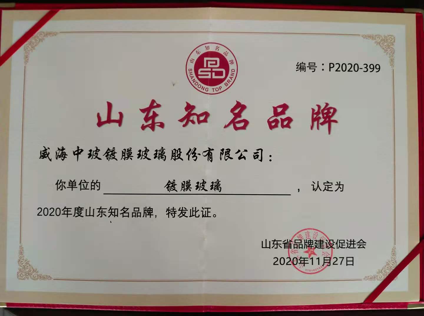 威海基地“镀膜玻璃”产品荣获2020年度“山东省知名品牌”