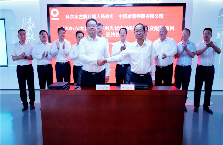 近日,内蒙古自治区通辽市科尔沁左翼后旗人民政府与中国玻璃控股有限公司关于“2×1200t/d太阳能装备用光伏电池封装材料及配套项目”签约仪式在上海成功举行,签约仪式由公司执行董事、行政总裁吕国主持。内蒙古自治区党委常委、通辽市委书记孟宪东及中国工程院院士,中国建材集团首席科学家,中建材玻璃新材料研究总院党委书记、院长,公司董事局主席彭寿出席仪式并发表重要讲话。