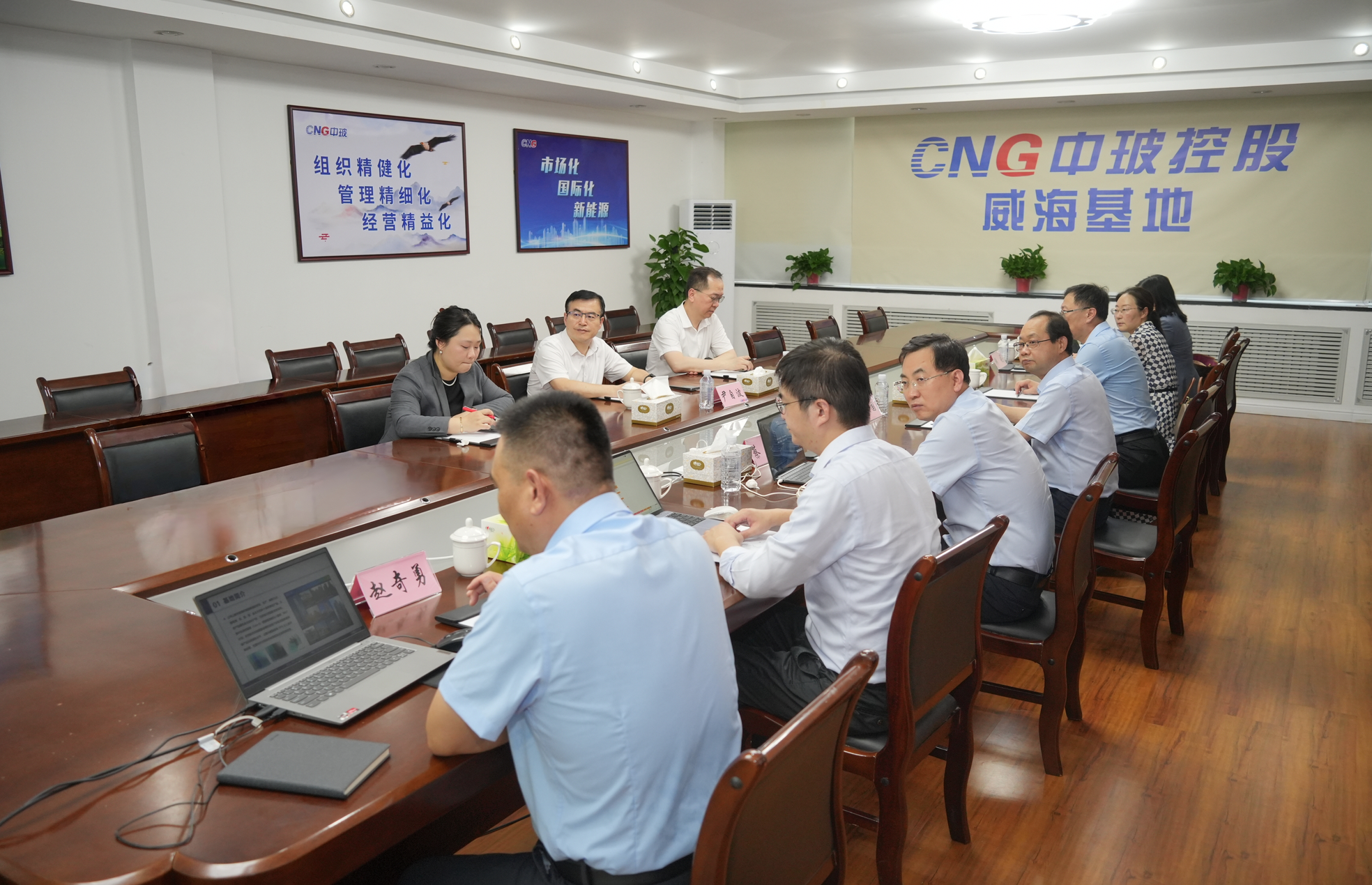 基地总经理赵奇勇介绍了威海基地的基本情况,并对上半年的经营情况和下半年重点工作计划进行汇报,尹自波对威海基地上半年的经营业绩给予了肯定,并对公司未来发展提出期望:一是提高企业竞争力,在市场寒冬的背景下,为了应对竞争压力,企业应提升自身核心竞争力,保持并强化公司的特色和优势。二是加快企业转型,加强在技术研发上的投入,推动企业绿色化、高端化、智能化、国际化发展。三是关注市场变化与政策动向,特别是新能源领域的国际标准与发展趋势,通过制定国际化发展战略来提升企业的全球竞争力。四是优化企业内部管理,提高项目的执行效率和质量,用更有效的管理机制来应对高负债和重资产带来的挑战。五是调整产能以应对市场竞争,建议在市场中设定合理的价格区间,以避免恶性竞争,同时建立相互监督机制,防止价格战对企业造成伤害。六是加强企业间的战略合作,通过资源共享和战略合作,共同开发市场,提高整体市场占有率。